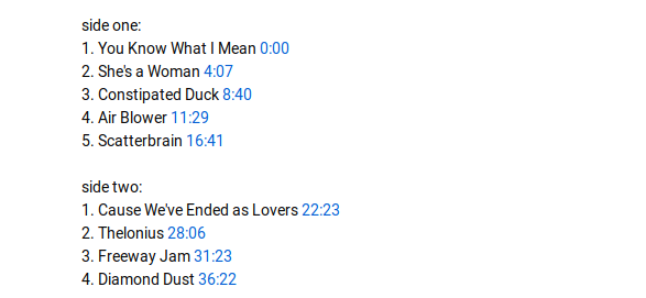 Jeff Beck sorry some songs are labeled wrong Trouble In Mind*Nursery Rhyme*Wandering Man Blues*Steeled Blues*Heart Full Of Soul*I'm Not Talking*I Ain't Done WrongThe Train Kept A-rollin'I'm A Man*shapes of thingsHappenings Ten Years Time Ago*Hot House Of Omagarashid*Lost Woman*The Nazz Are BluePsycho Daisies*Jeff's BoogieToo Much Monkey Business*The Sun Is Shining*You're A Better Man Than I*Love Me Like I Love You*Hi Ho Silver Lining*Tally Man*Beck's BoleroShapes of ThingsI Ain't SuperstitiousRock My Plimsoul*Jailhouse RockDrinking Again*Definitely MaybeNew Ways Train TrainGoing DownI Can't Give Back the Love I Feel for YouSuperstitionBlack Cat MoanBlues Deluxe/BBA BoogieJizz WhizzCause We've Ended As LoversGoodbye Pork Pie HatLove Is GreenDiamond DustFreeway JamThe PumpPeople Get ReadyEscapeGets Us All in the EndBack On The StreetWild ThingThe Train Kept A-rollin'Sleep WalkThe Stumble (Live 1995)Big BlockWhere Were YouRack My MindPlynth blow by blow full album
